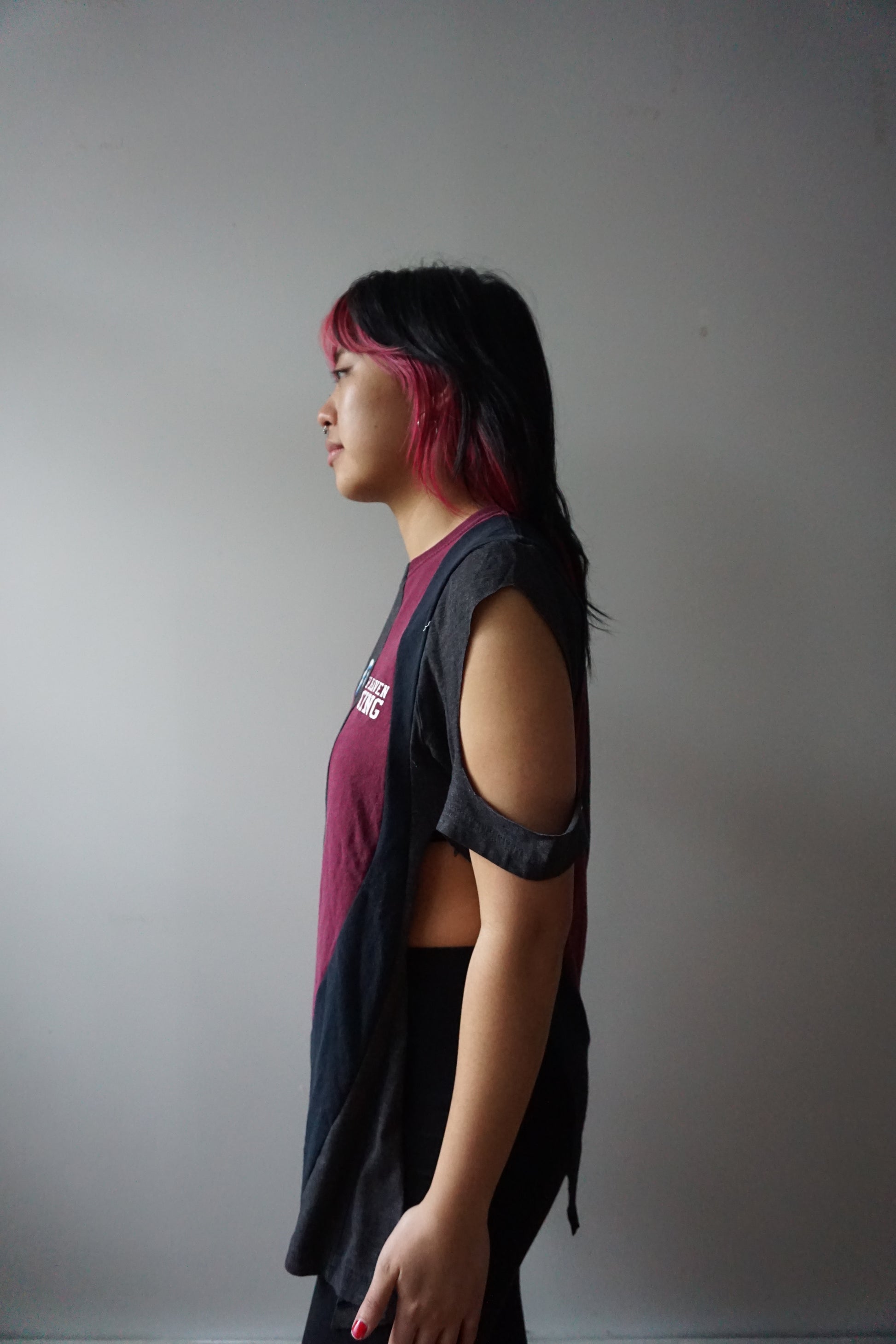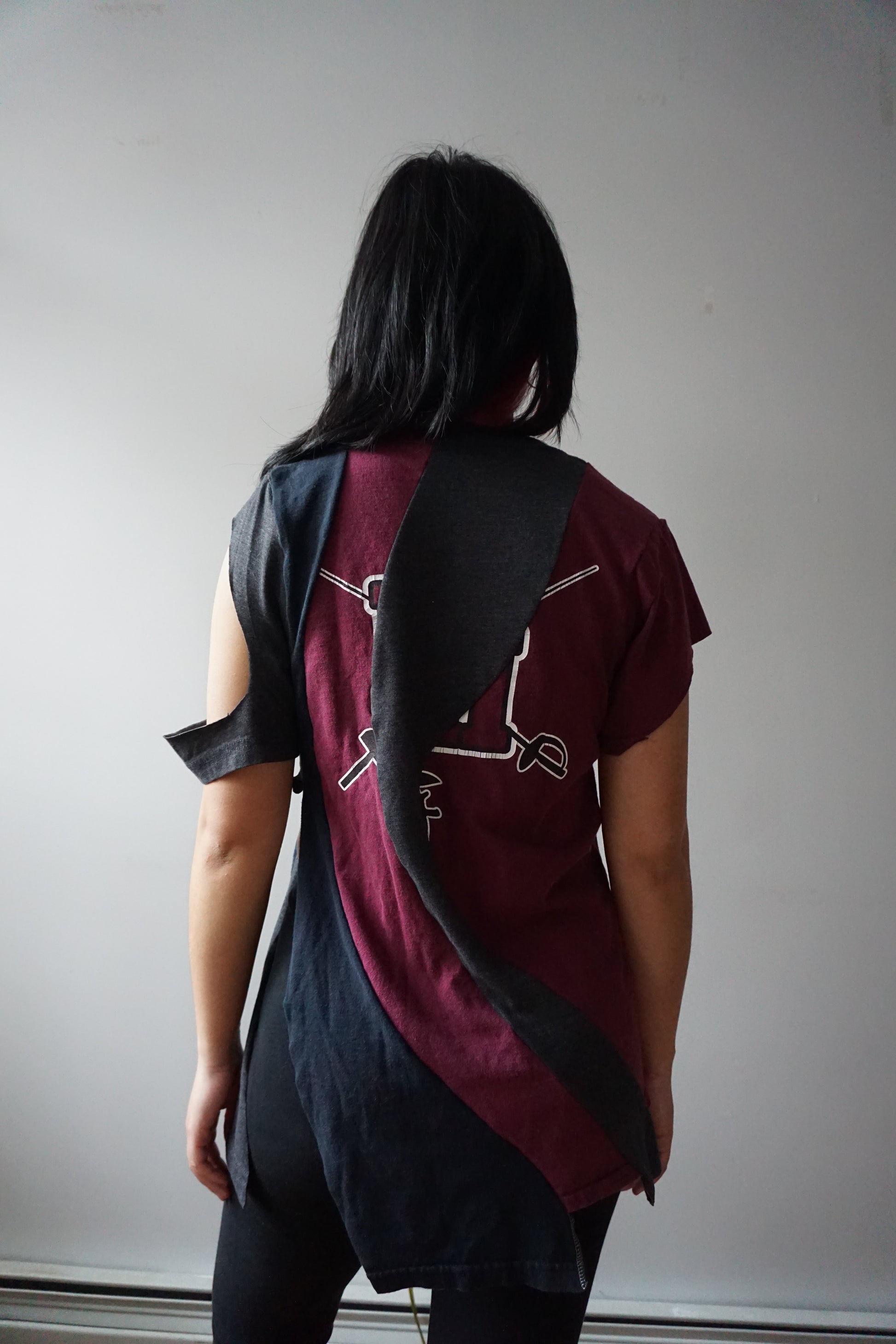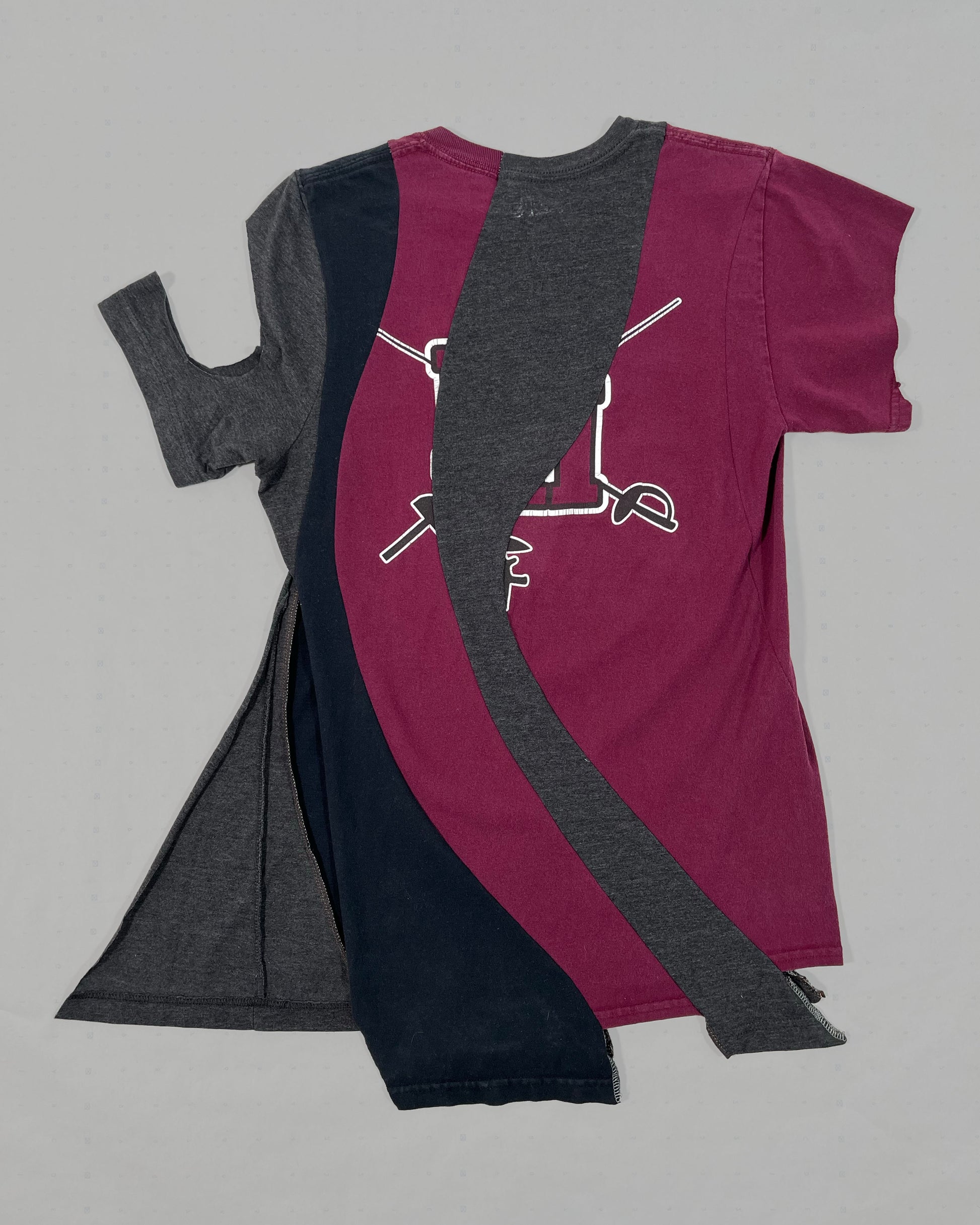 Patchworked t-shirt with shoulder cutout and side slit, made from t-shirts.
